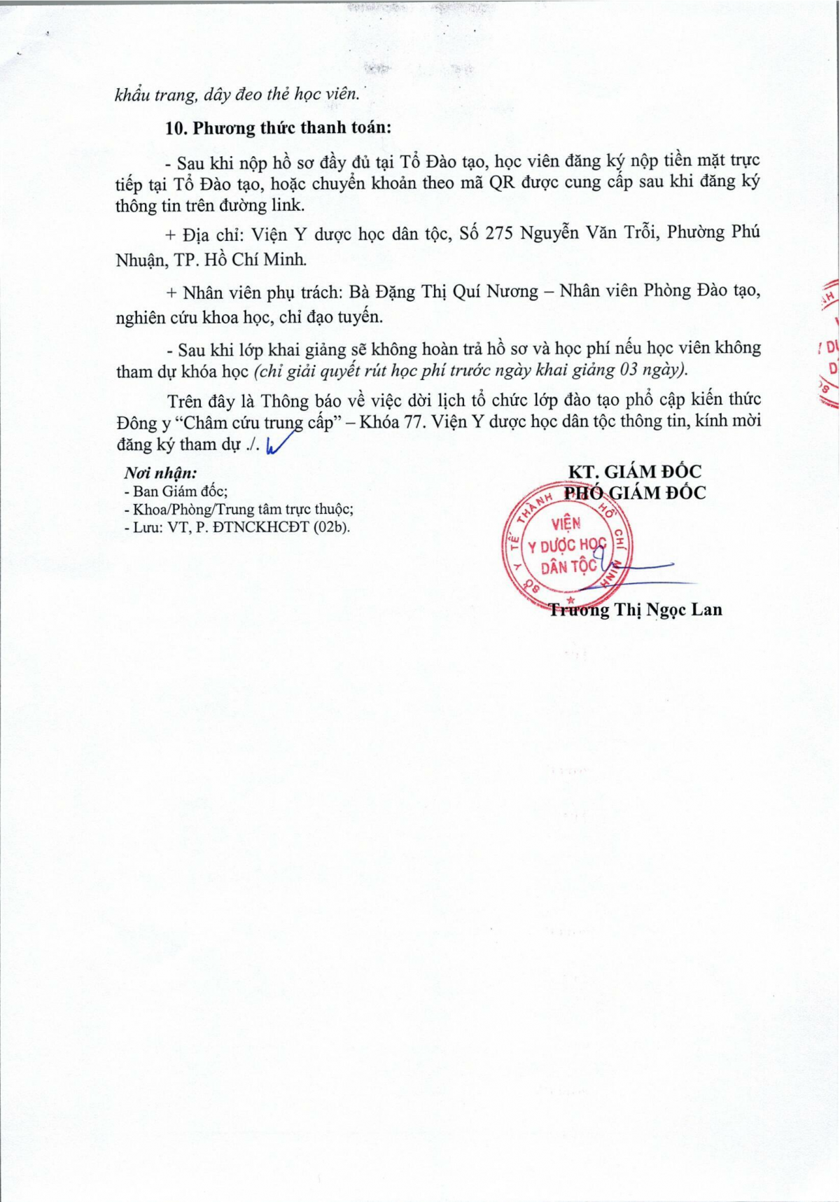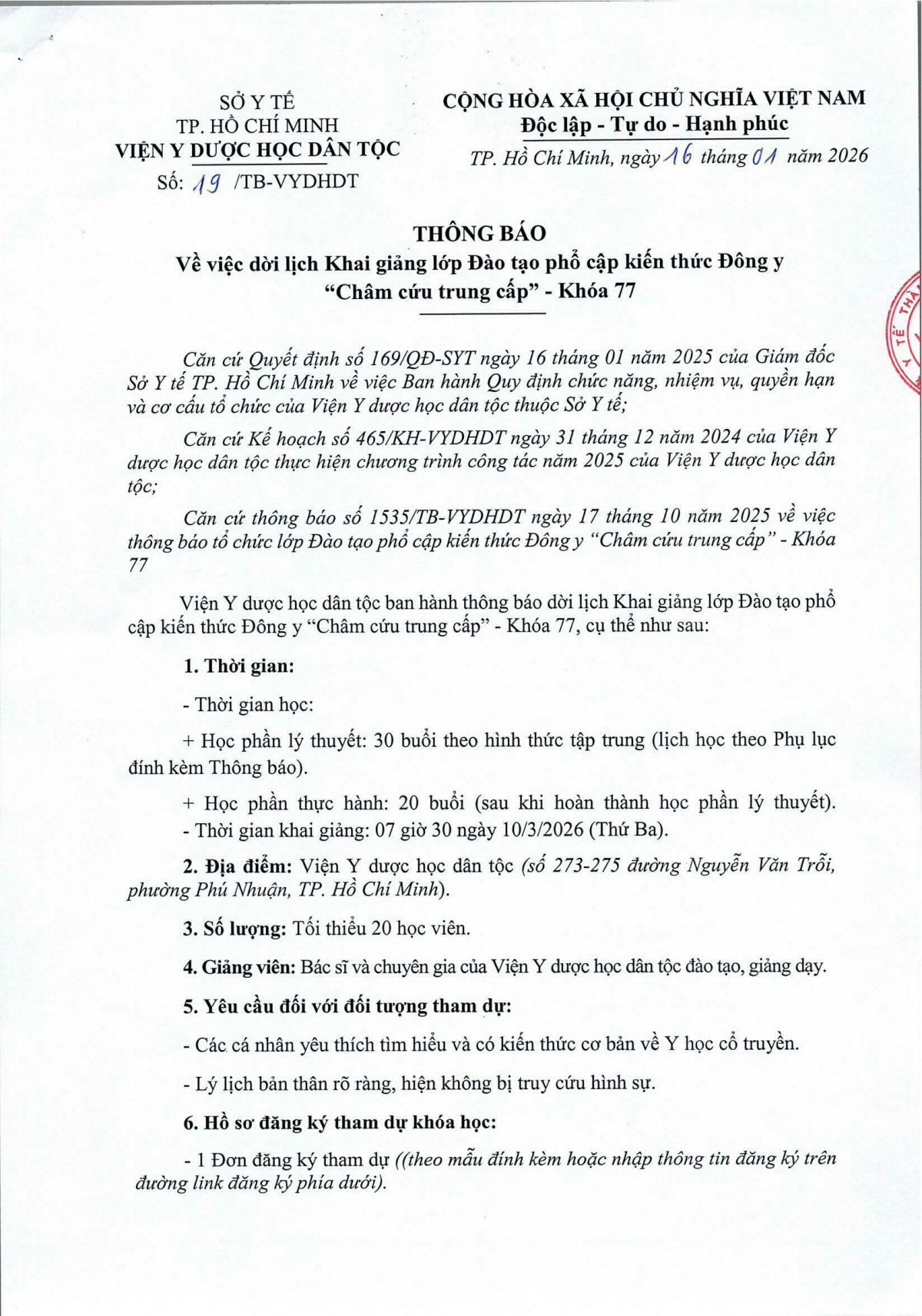 Thông báo 19 về việc dời lịch khai giảng lớp đào tạo phổ cập kiến thức Đông y Châm cứu trung cấp khóa 77.