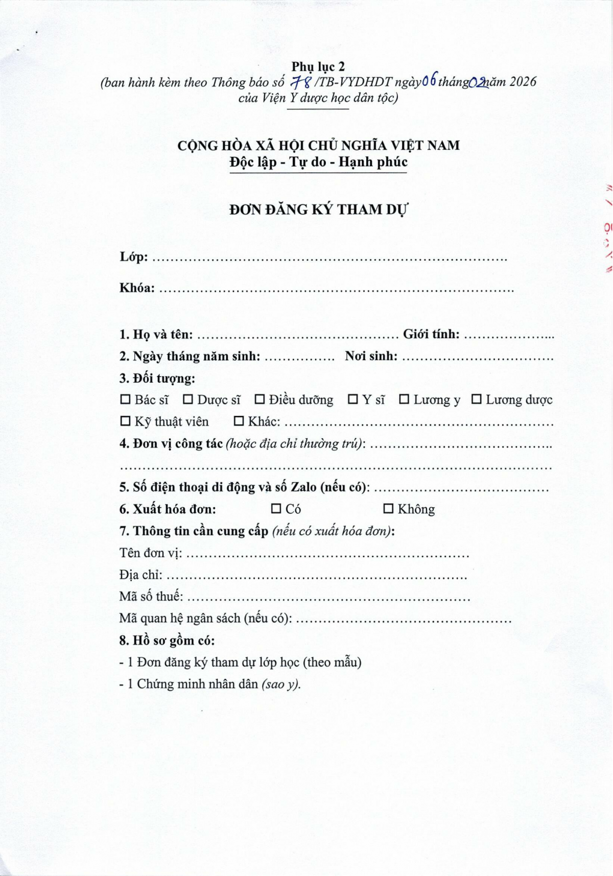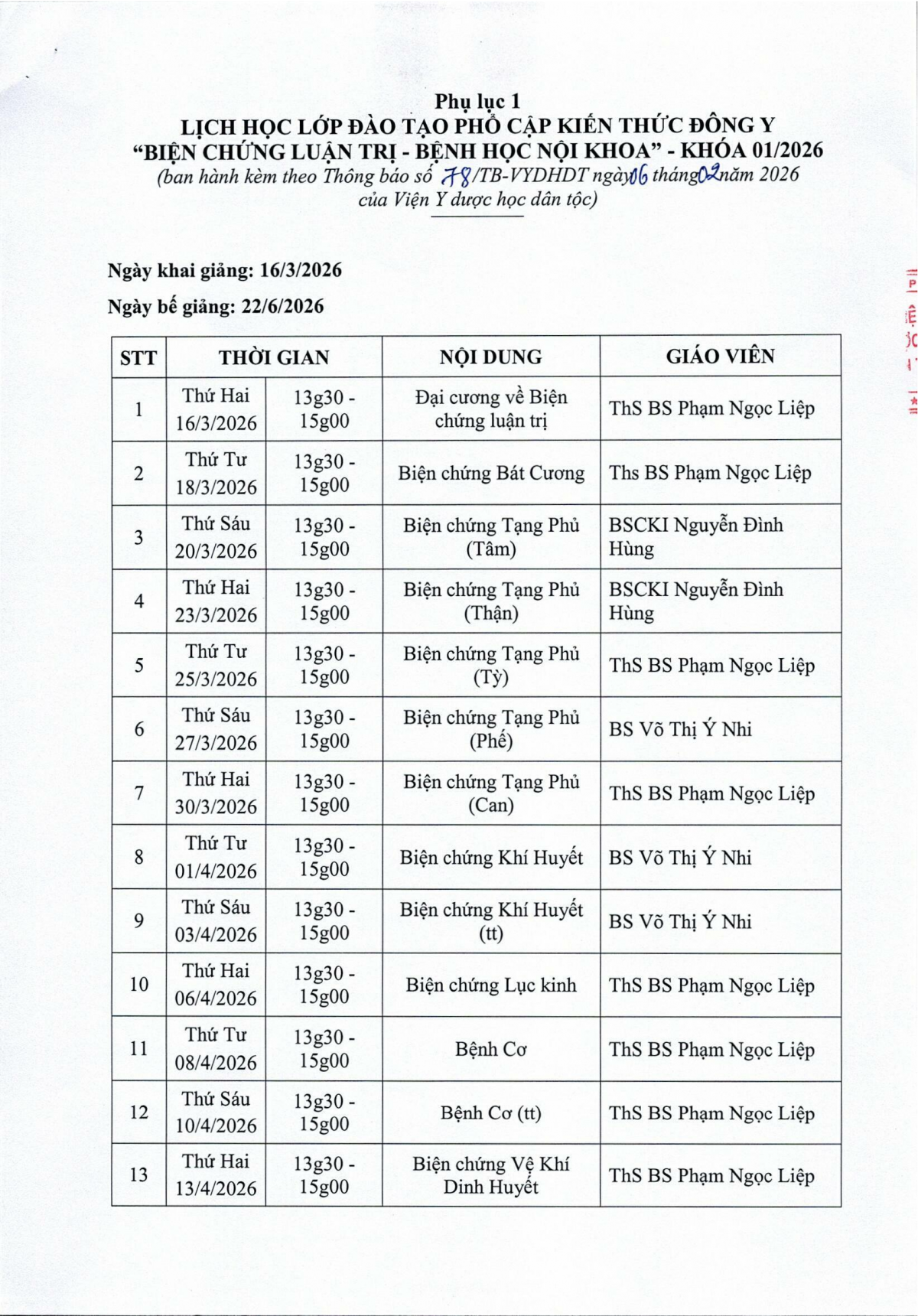 Thông báo 78 về việc tổ chức lớp đào tạo phổ cập kiến thức Đông y Biện chứng luận trị- Bệnh học nội khoa khóa 01 năm 2026