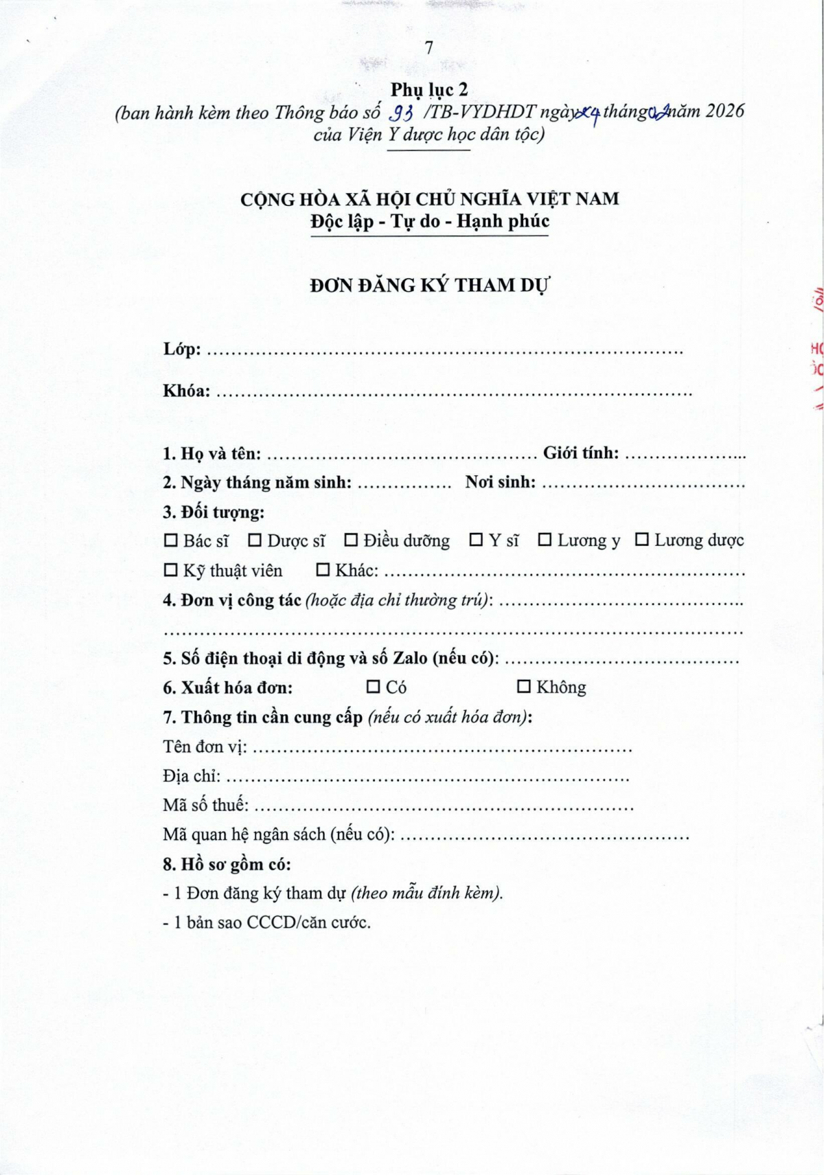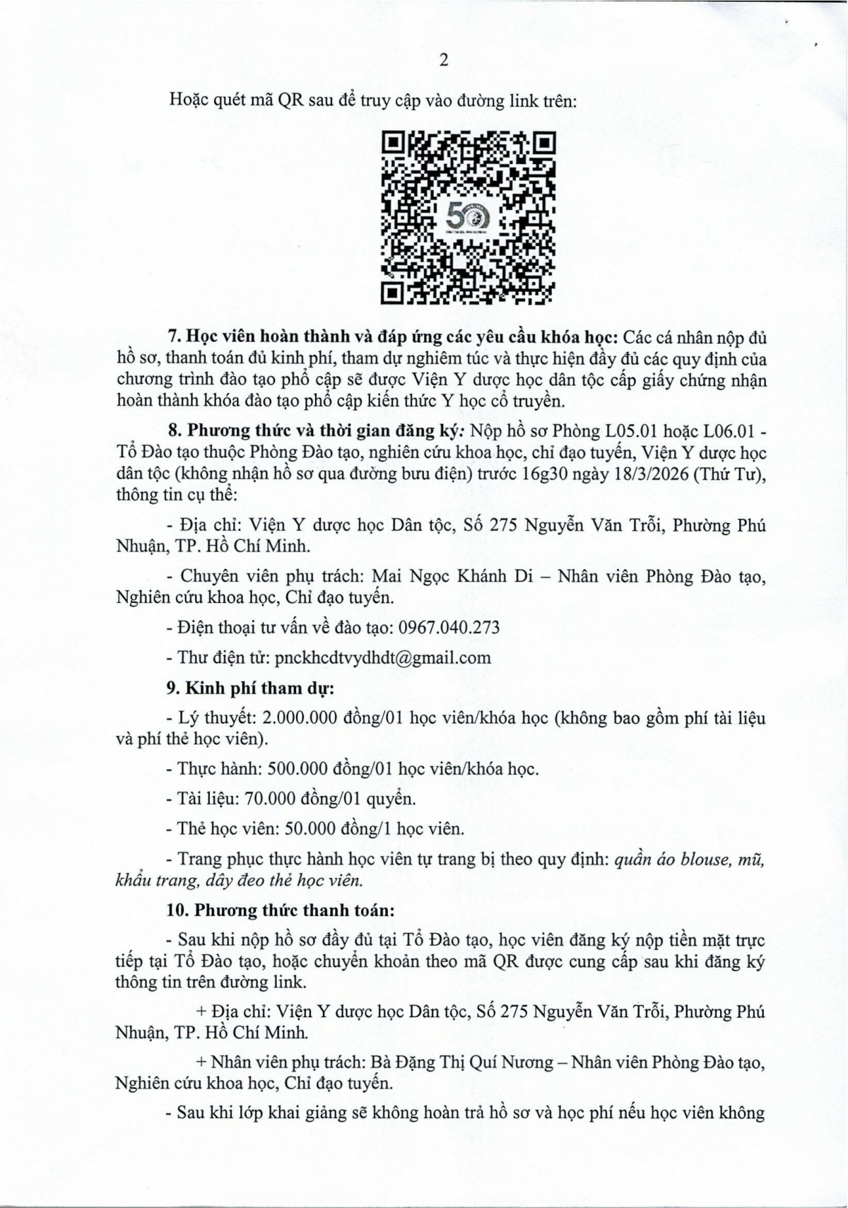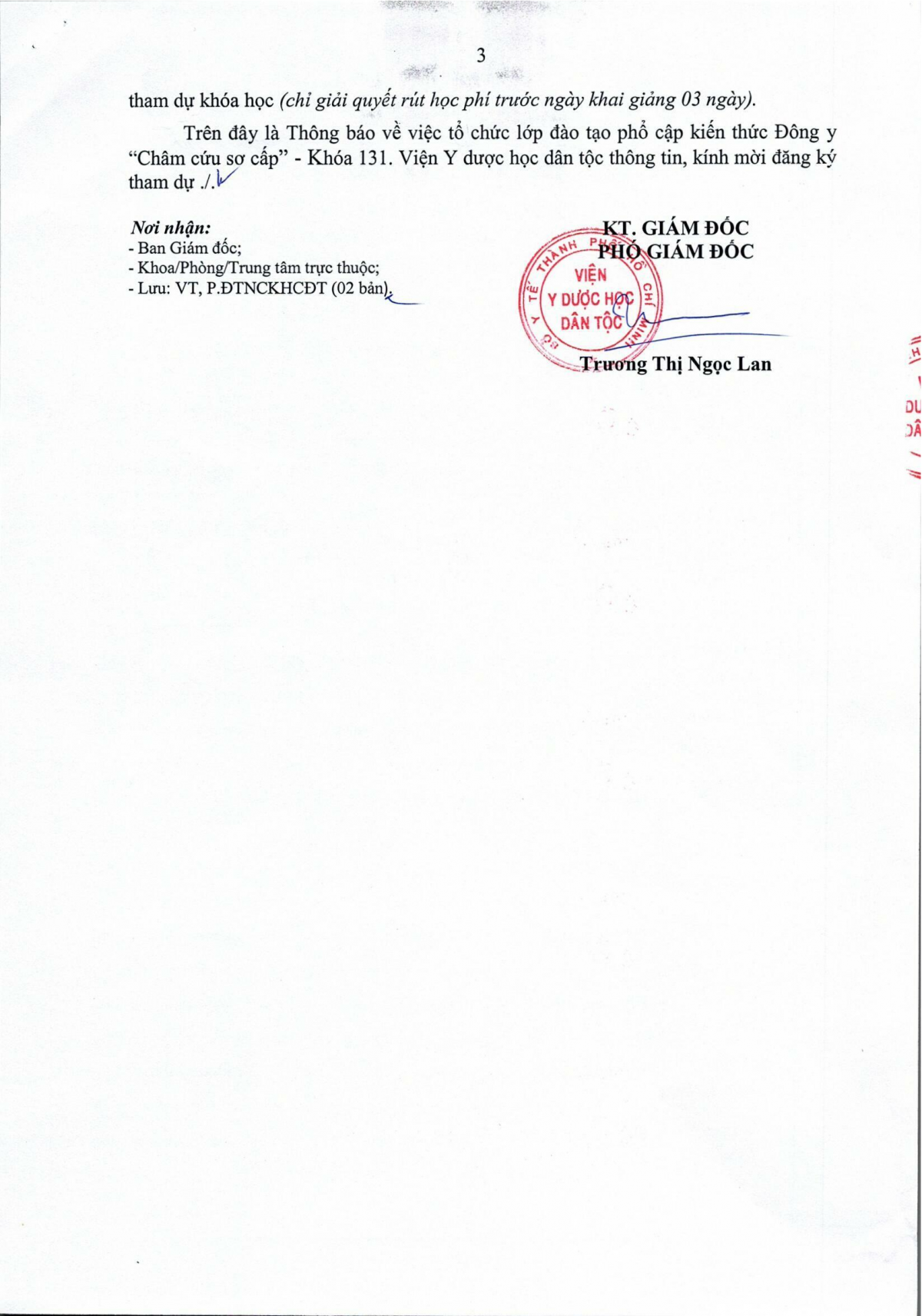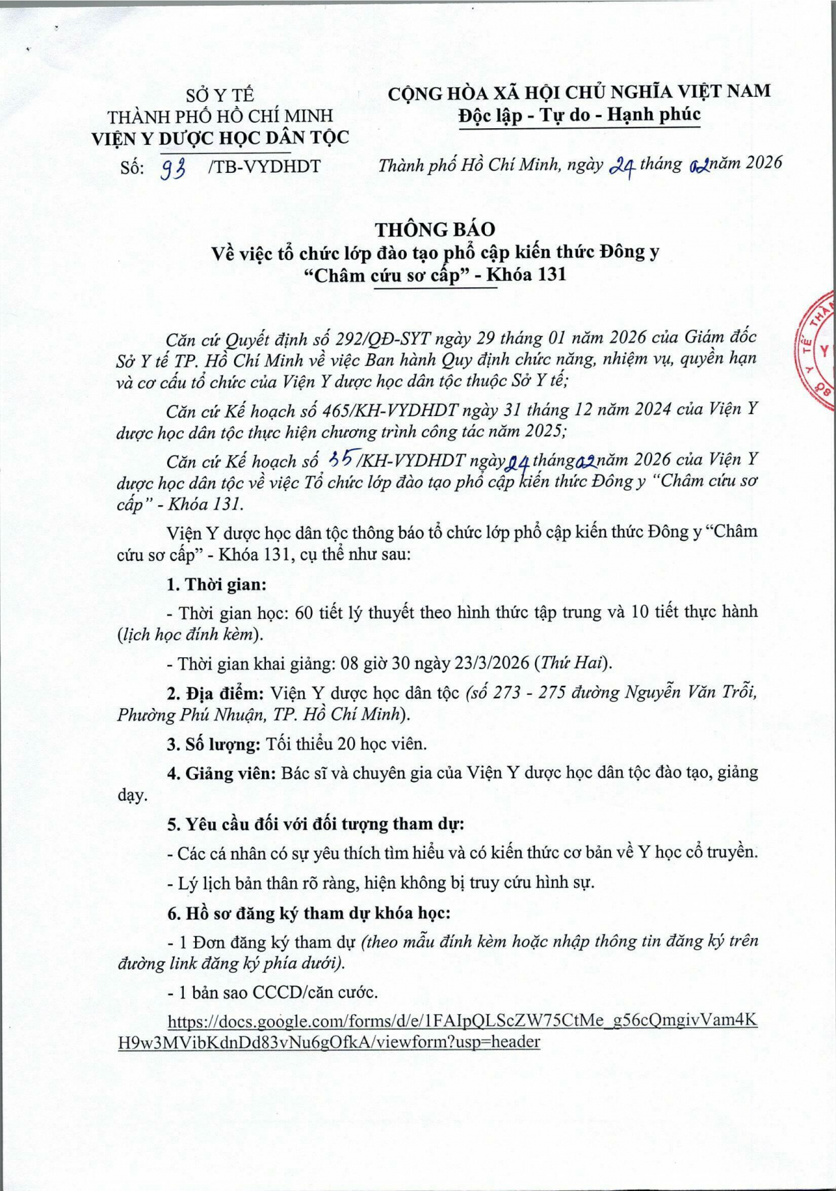 Thông báo 93 về việc Tổ chức lớp đào tạo phổ cập kiến thức Đông y Châm cứu sơ cấp khóa 131