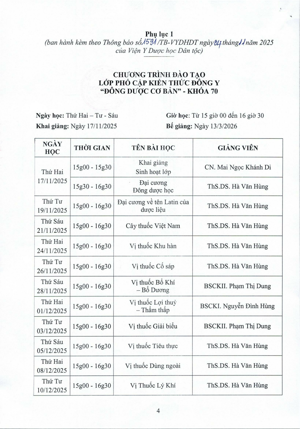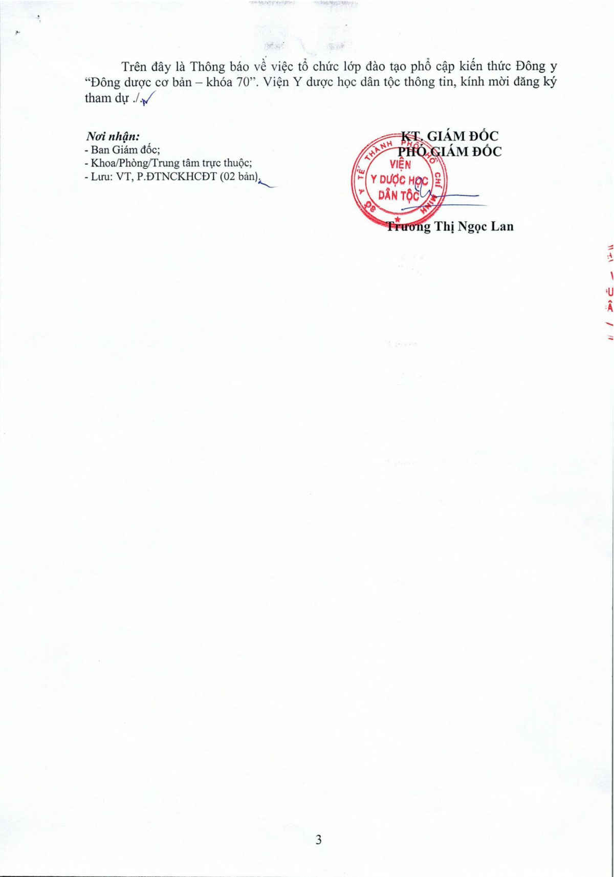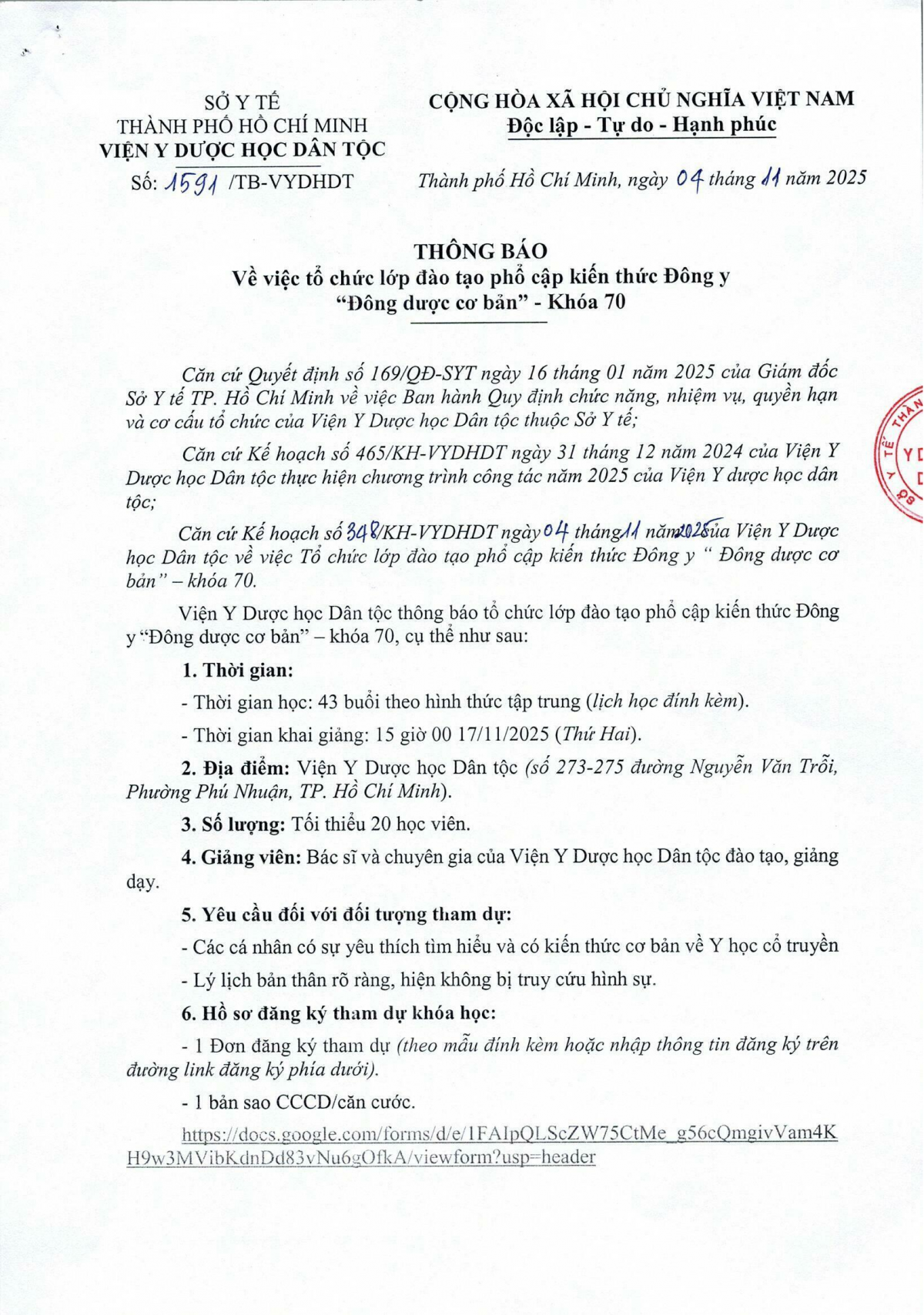 Thông báo 1591 về việc tổ chức lớp đào tạo phổ cập kiến thức Đông y Đông dược cơ bản khóa 70