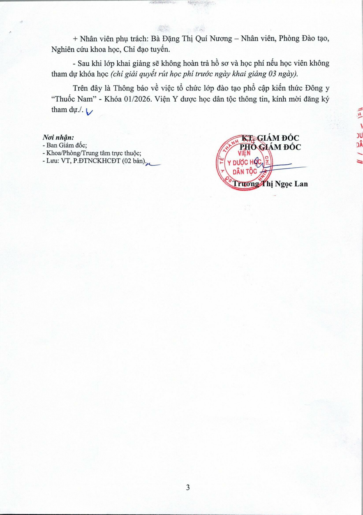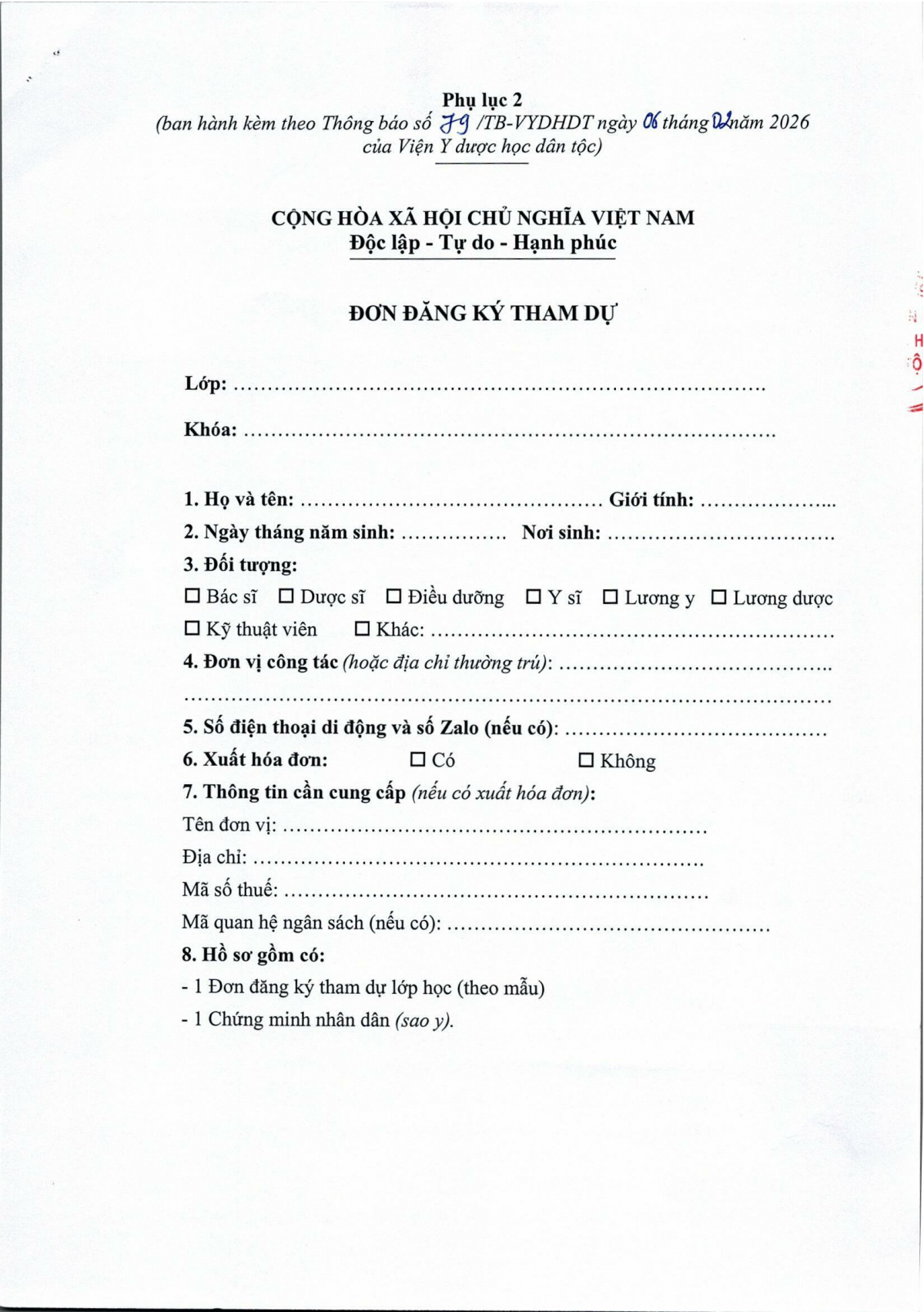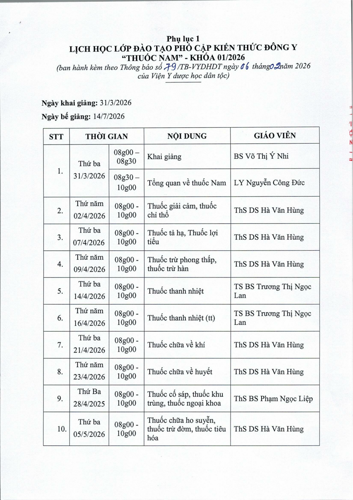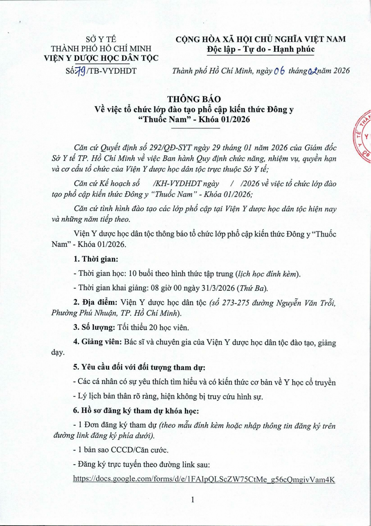 Thông báo 79 về việc tổ chức lớp đào tạo phổ cập kiến thức Đông y Thuốc Nam khóa 01 năm 2026