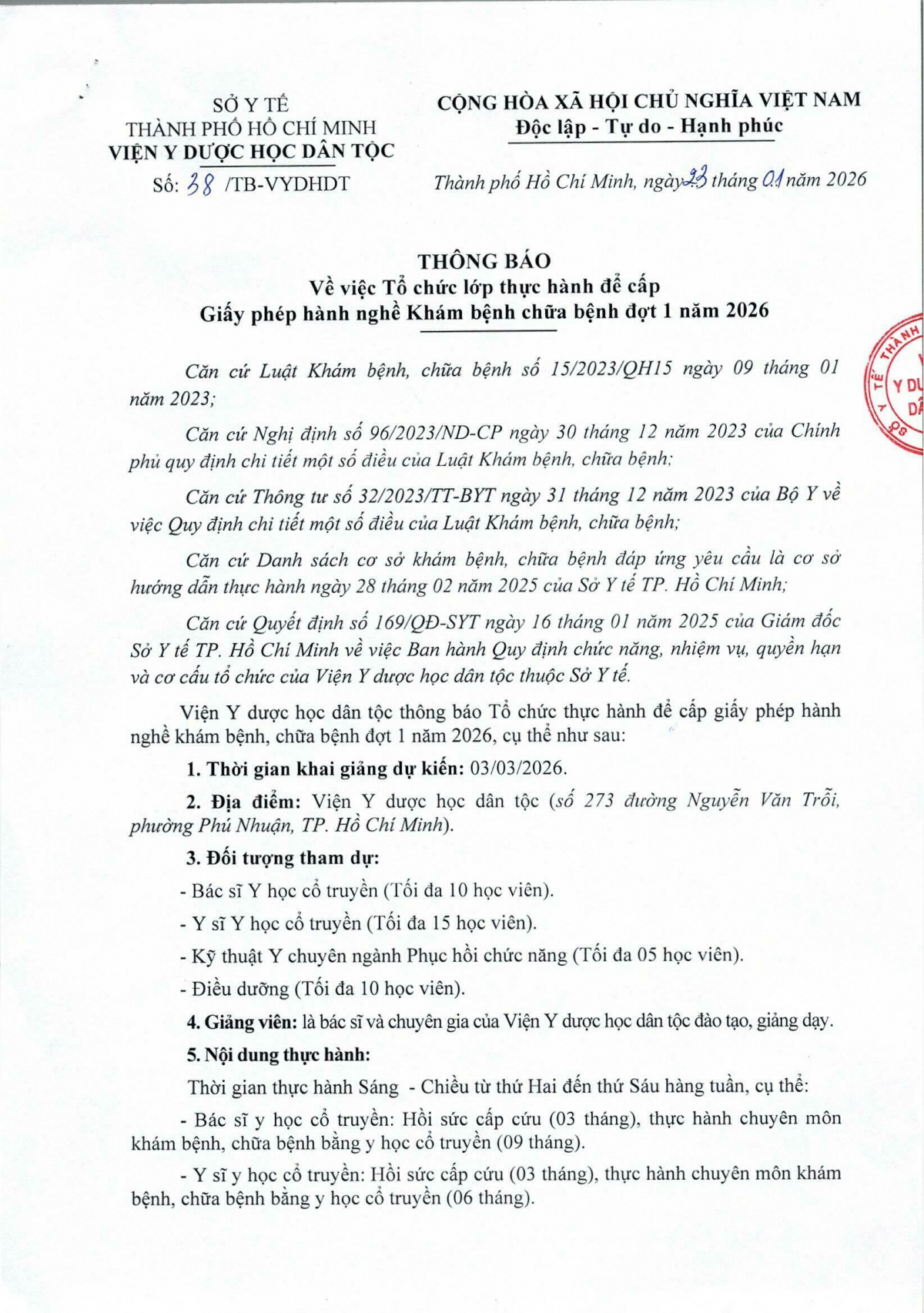 Thông báo số 38 về việc tổ chức lớp thực hành để cấp Giấy phép hành nghề Khám bệnh chữa bệnh đợt 1 năm 2026