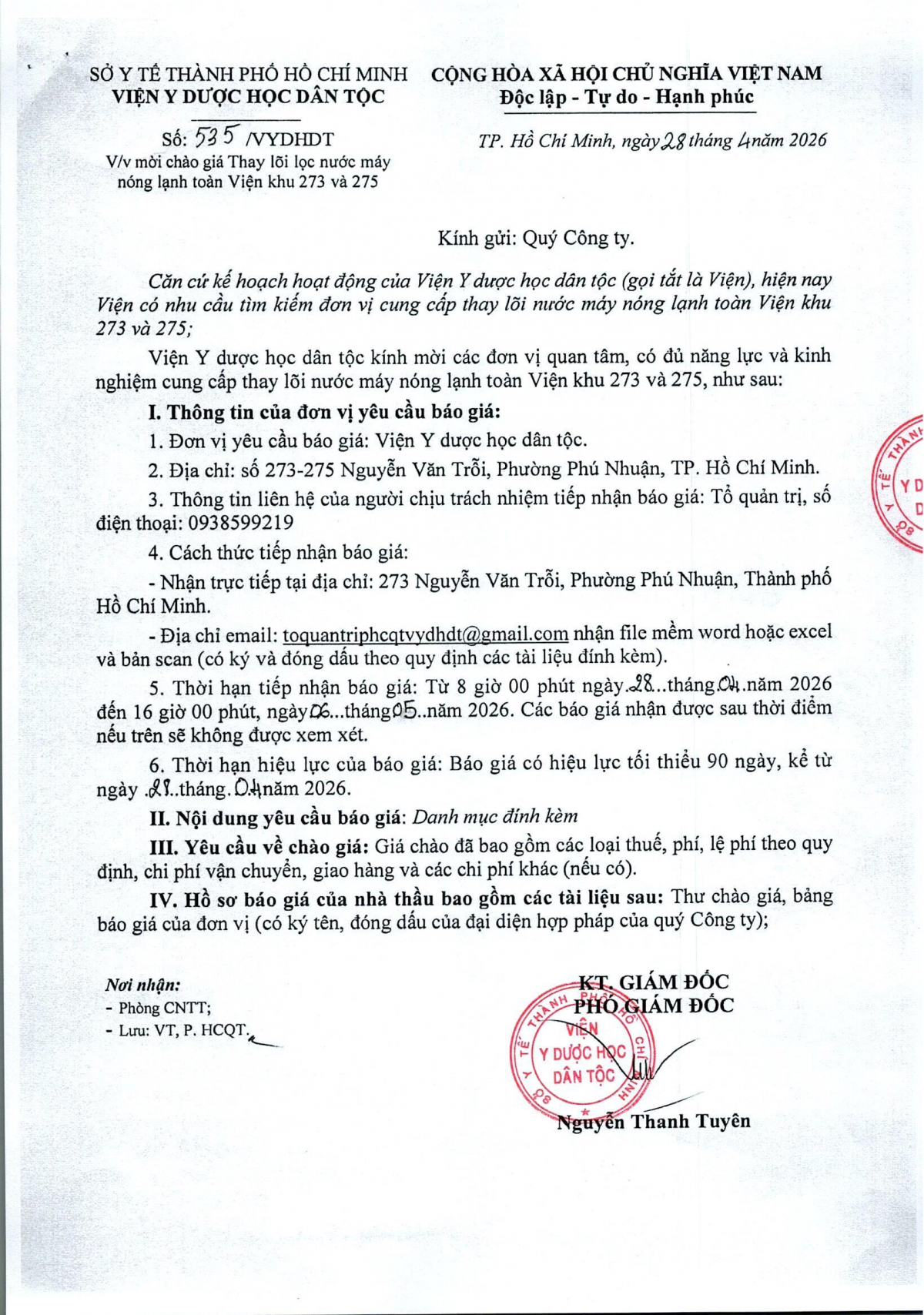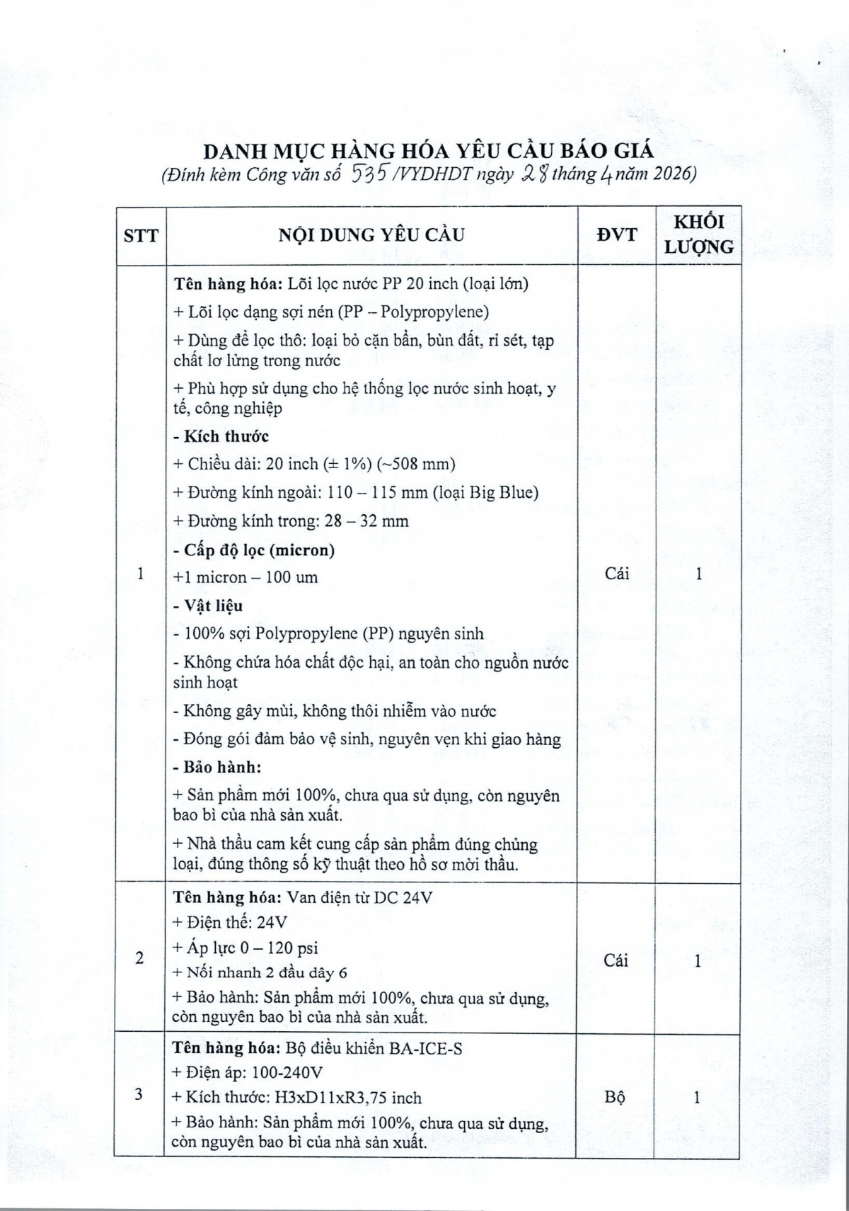MUA SẮM - ĐẤU THẦU Công văn mời chào giá thay lõi lọc nước máy nóng lạnh toàn Viện khu 273-275 Công văn 535 mời chào giá thay lõi lọc nước máy nóng lạnh toàn Viện khu 273-275 28/04/2026 29 Share on Facebook Tweet on Twitter tweet