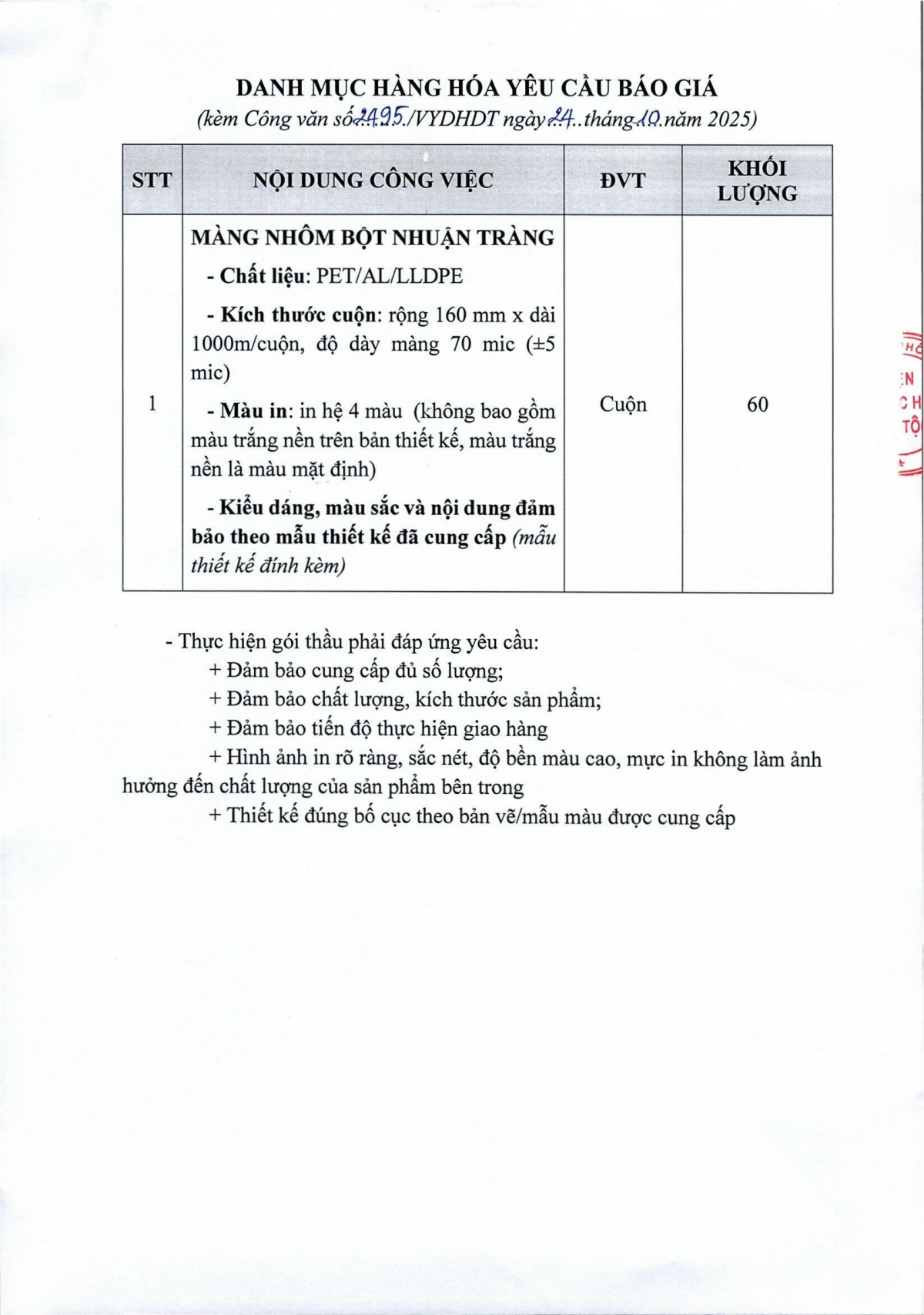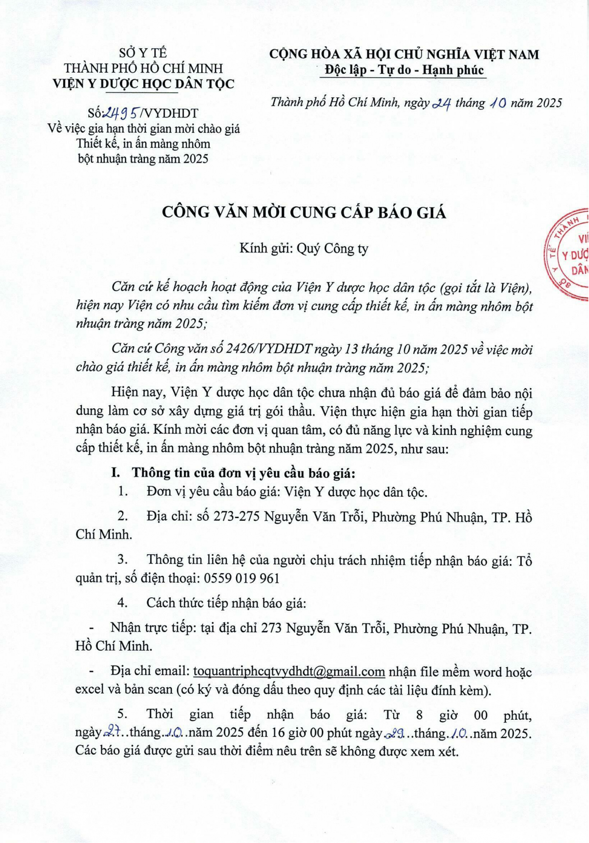 Công văn 2495 về việc gia hạn thời gian mời chào giá Thiết kế, in ấn màng nhôm bột nhuận tràng năm 2025