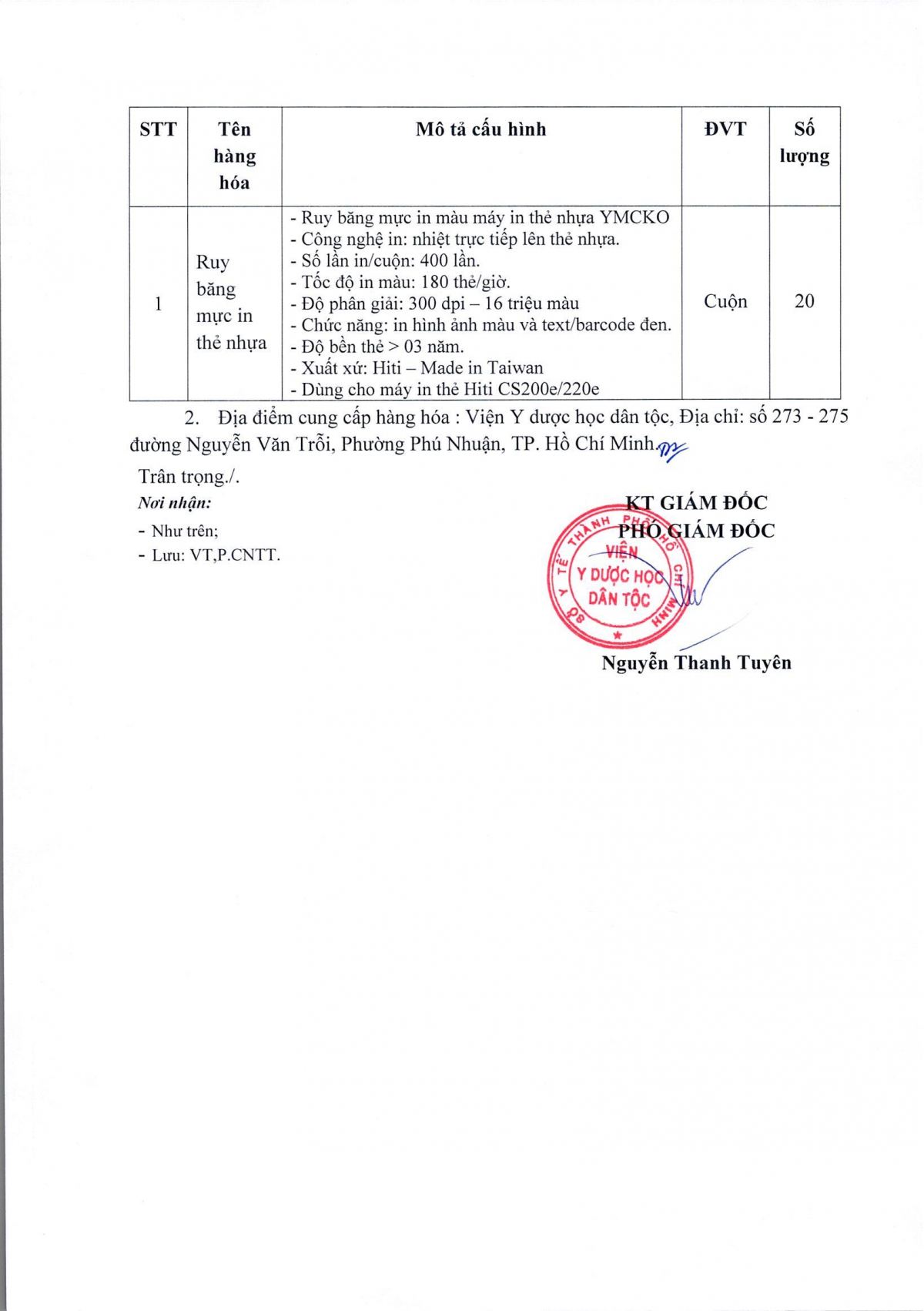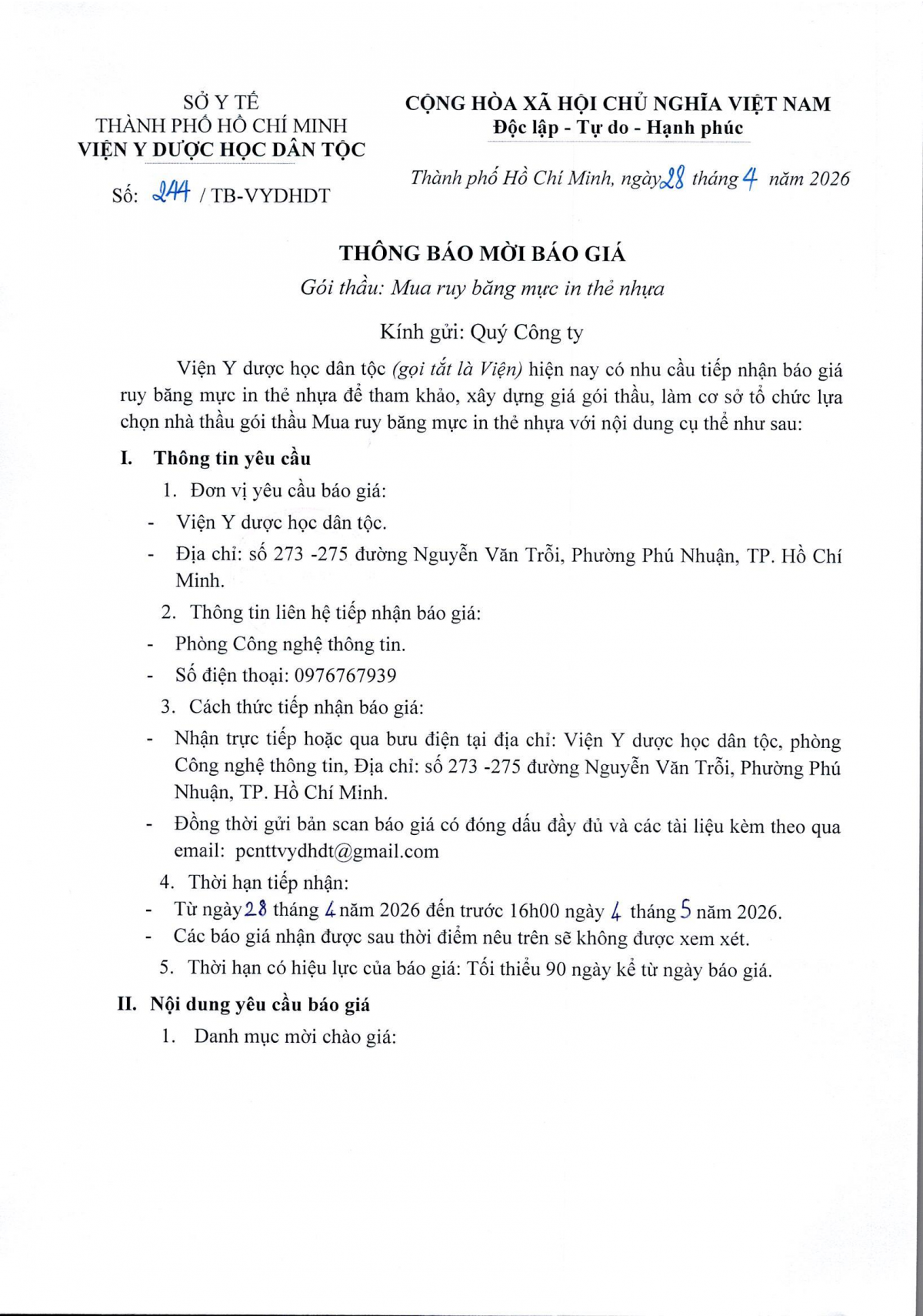 MUA SẮM - ĐẤU THẦU Thông báo mời báo giá ruy băng mực in thẻ nhựa Thông báo số 244 mời báo giá ruy băng mực in thẻ nhựa 28/04/2026 9 Share on Facebook Tweet on Twitter tweet