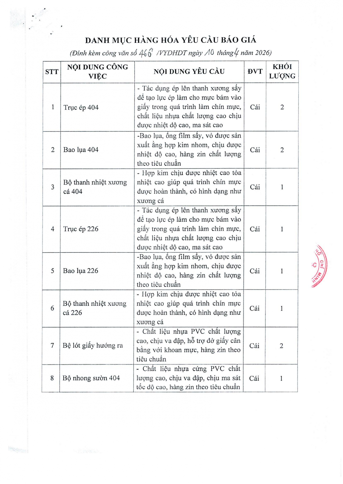 MUA SẮM - ĐẤU THẦU Thông báo mời chào giá cung cấp linh kiện mực in Công văn 466 về việc mời chào giá cung cấp linh kiện mực in 10/04/2026 6 Share on Facebook Tweet on Twitter tweet