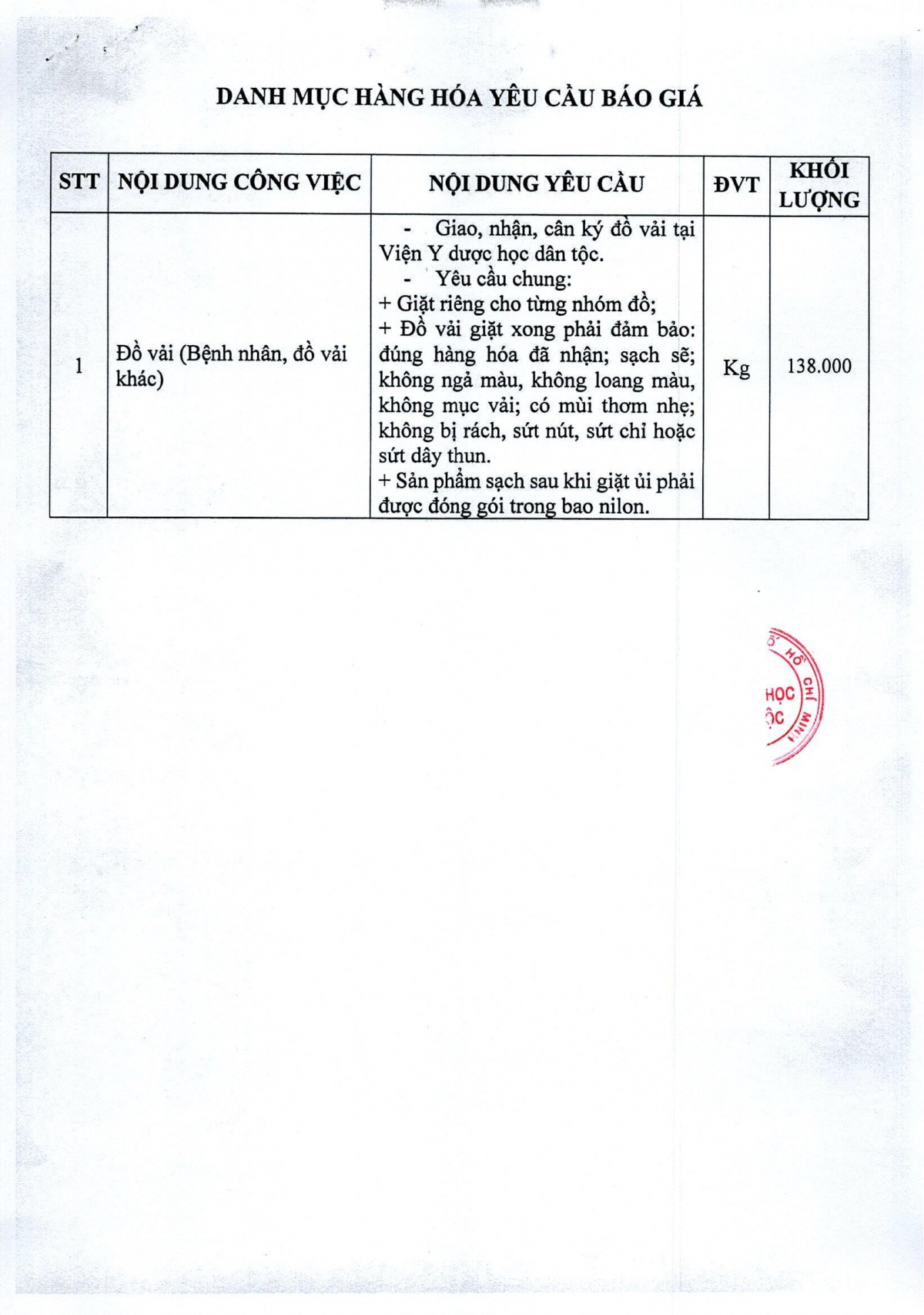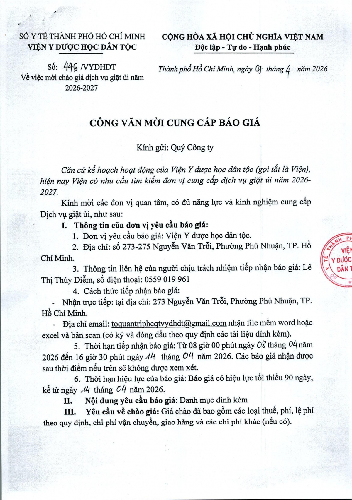 MUA SẮM - ĐẤU THẦU Thông báo mời chào giá dịch vụ giặt ủi năm 2026-2027 07/04/2026 5 Share on Facebook Tweet on Twitter tweet