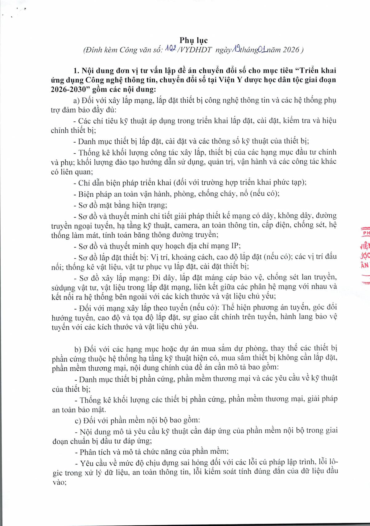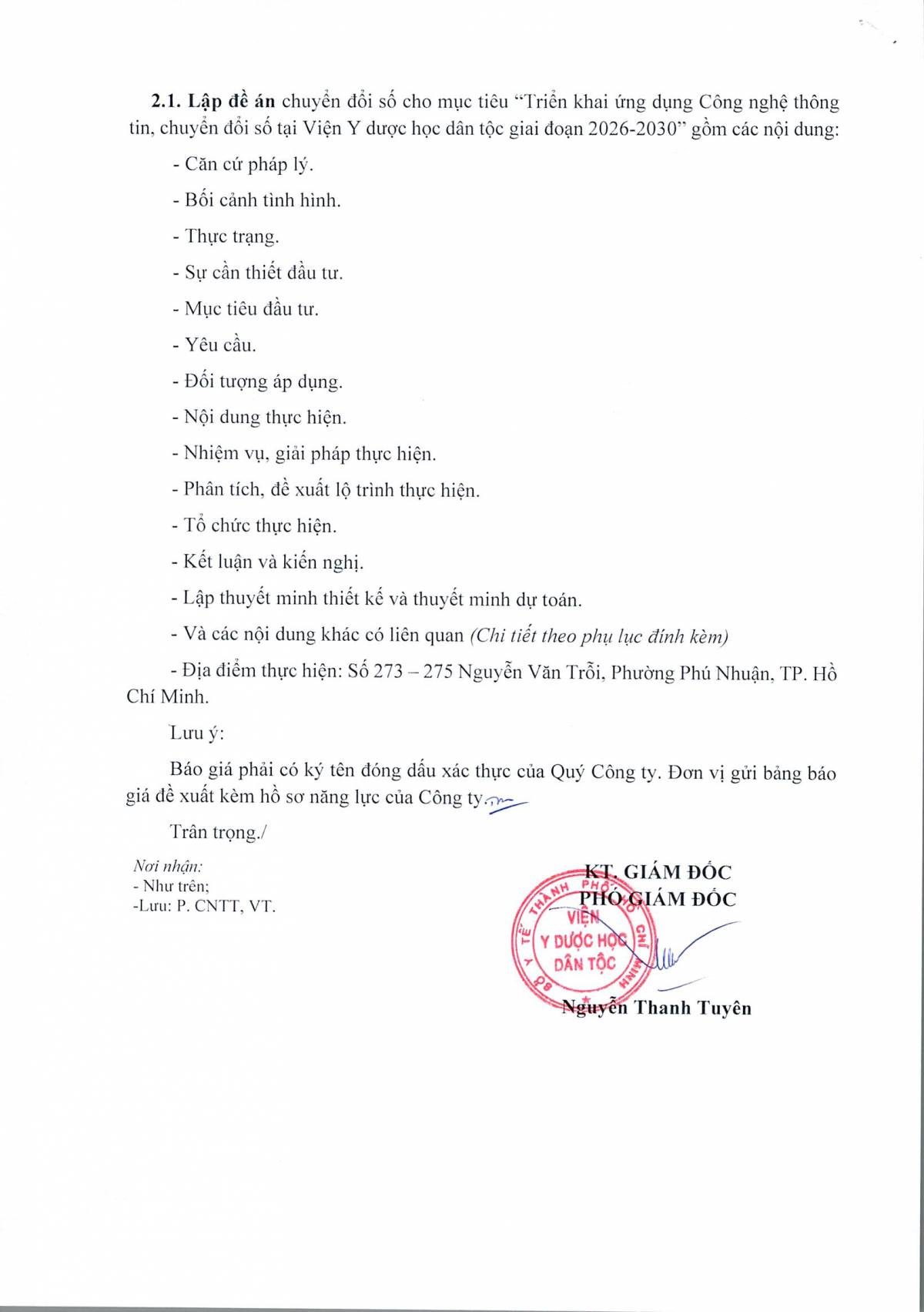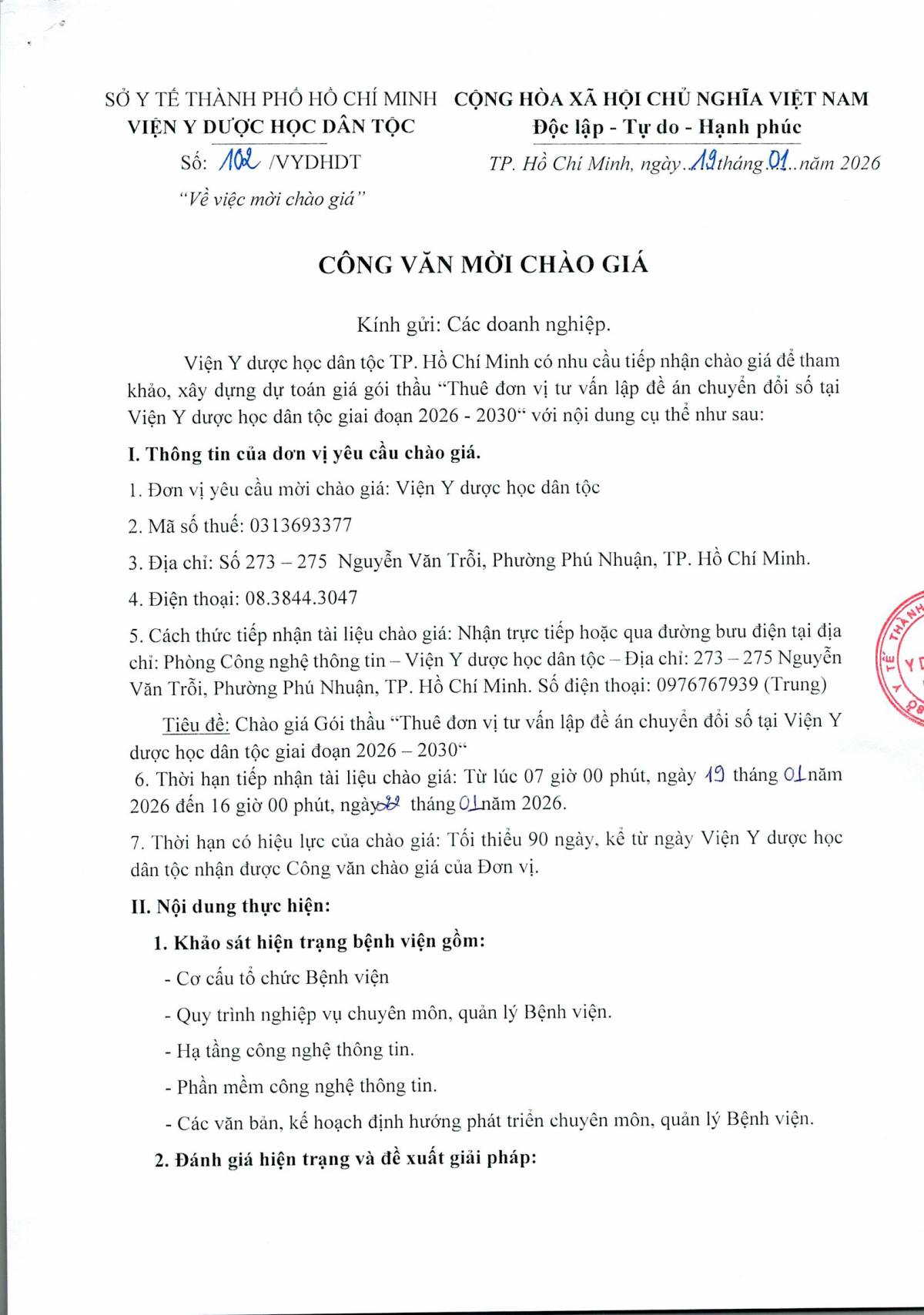Công văn số 102 mời chào giá gói thầu "Thuê đơn vị tư vấn lập đề án chuyển đổi số tại Viện Y dược học dân tộc giai đoạn 2026 - 2030"