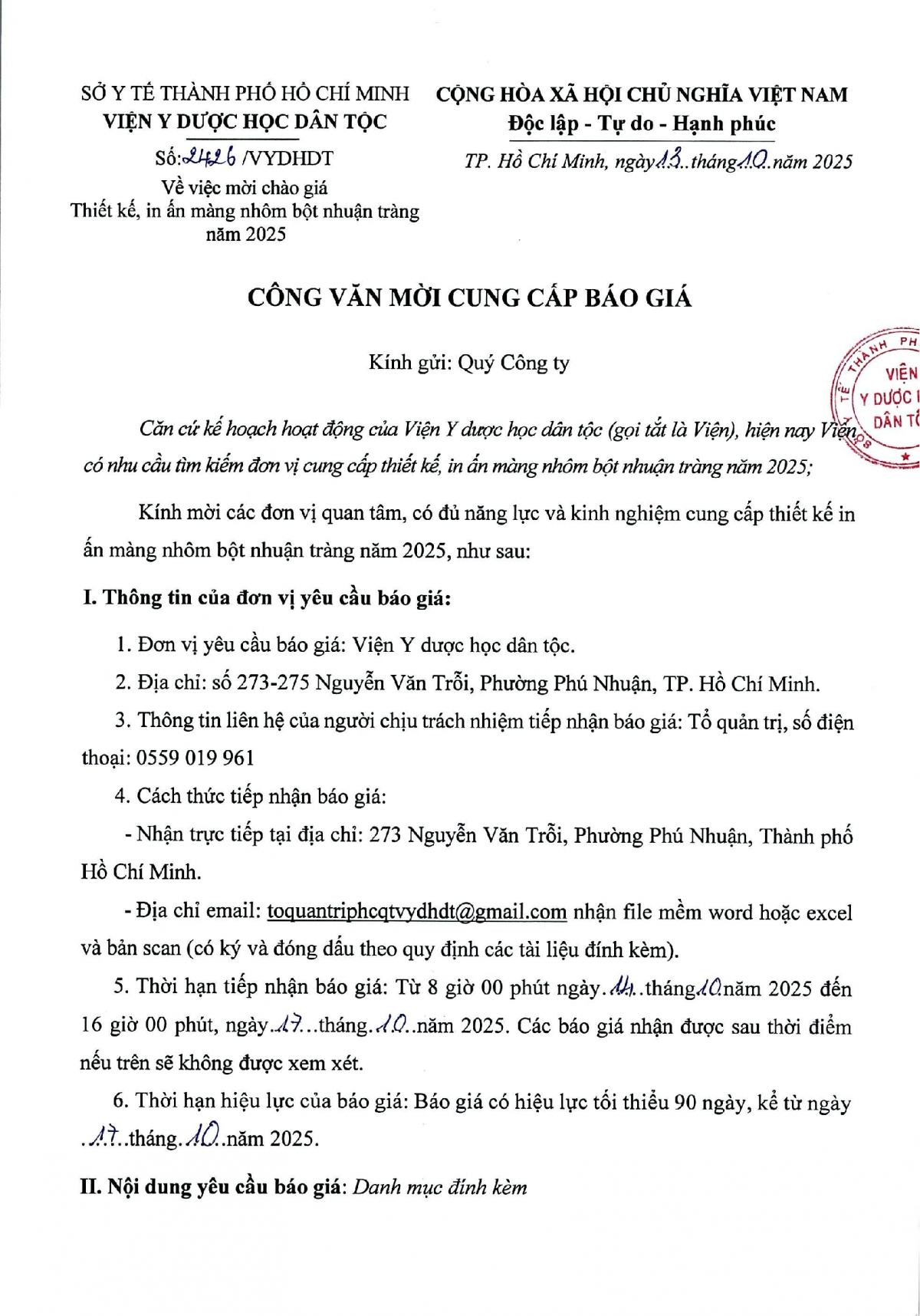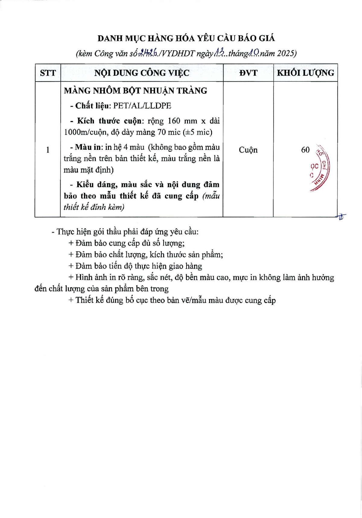 MUA SẮM - ĐẤU THẦU Thông báo mời chào giá thiết kế, in ấn màng nhôm bột nhuận tràng năm 2025 Công văn 2426 chào giá thiết kế, in ấn màng nhôm bột nhuận tràng năm 2025 14/10/2025 18 Share on Facebook Tweet on Twitter tweet