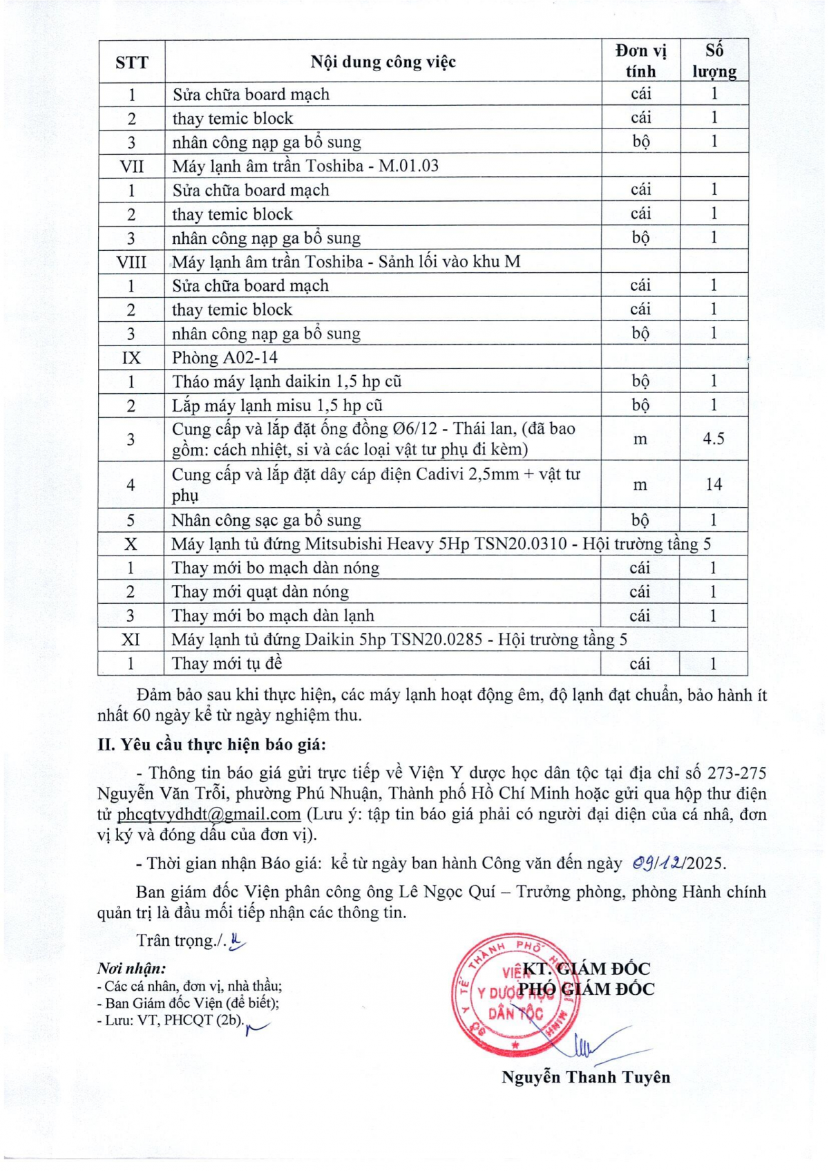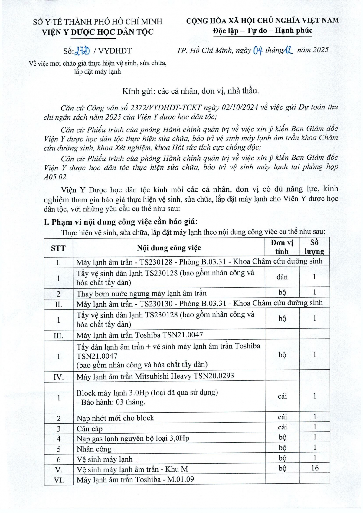 MUA SẮM - ĐẤU THẦU Thông báo mời chào giá thực hiện vệ sinh, sửa chữa lắp đặt máy lạnh Công văn 2720 về mời chào giá thực hiện vệ sinh, sửa chữa lắp đặt máy lạnh 05/12/2025 14 Share on Facebook Tweet on Twitter tweet
