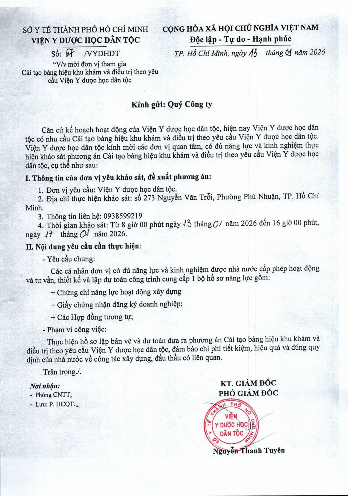 Công văn số 67 của Viện Y dược học dân tộc mời đơn vị tham gia cải tạo bảng hiệu khu khám và điều trị theo yêu cầu