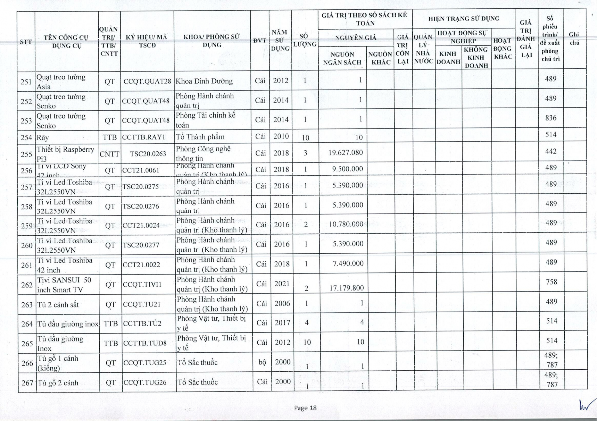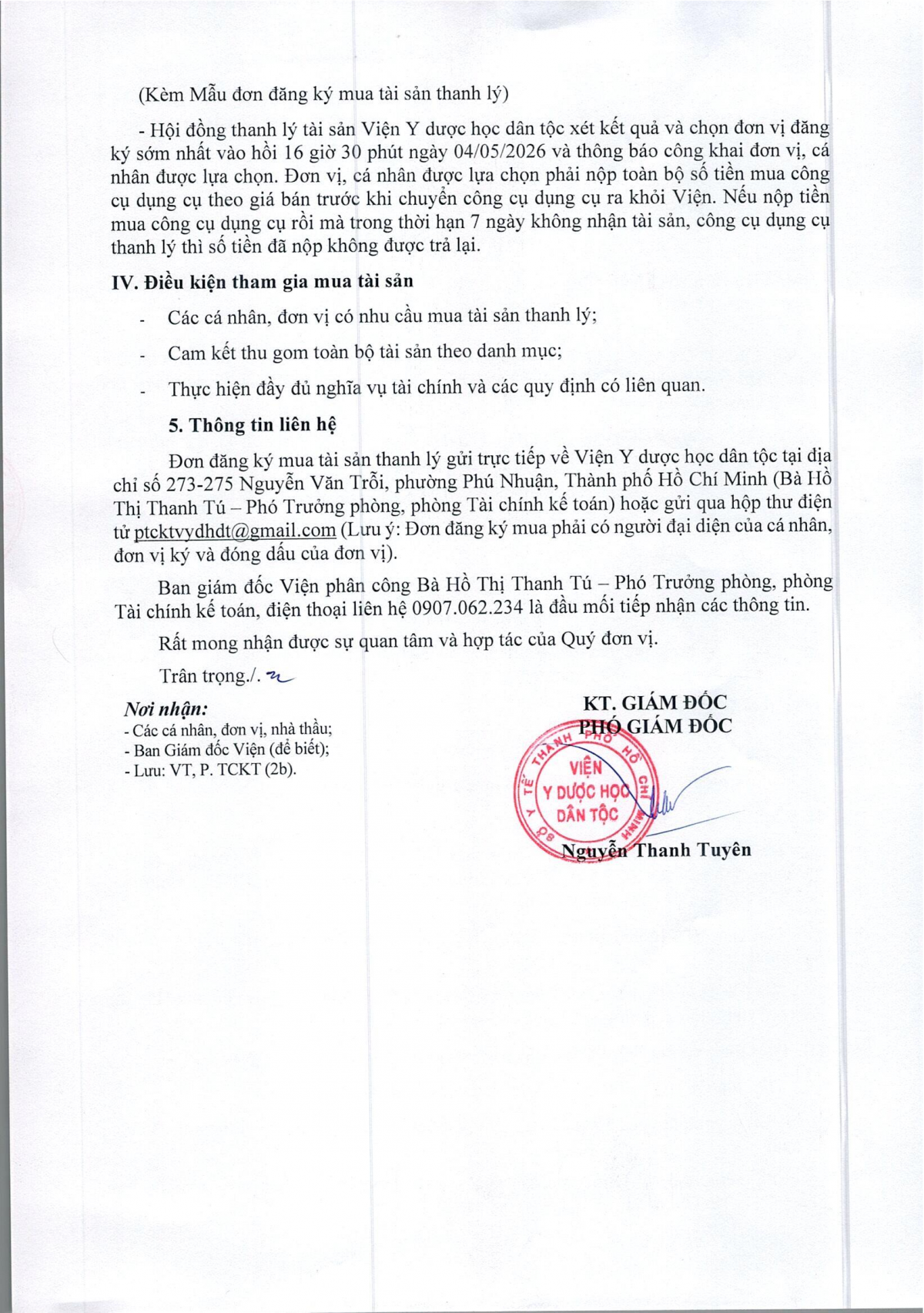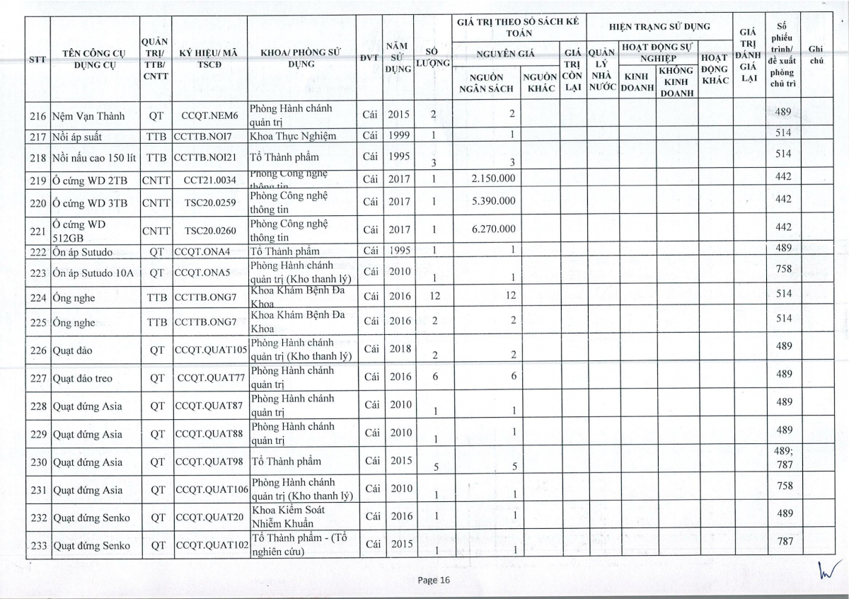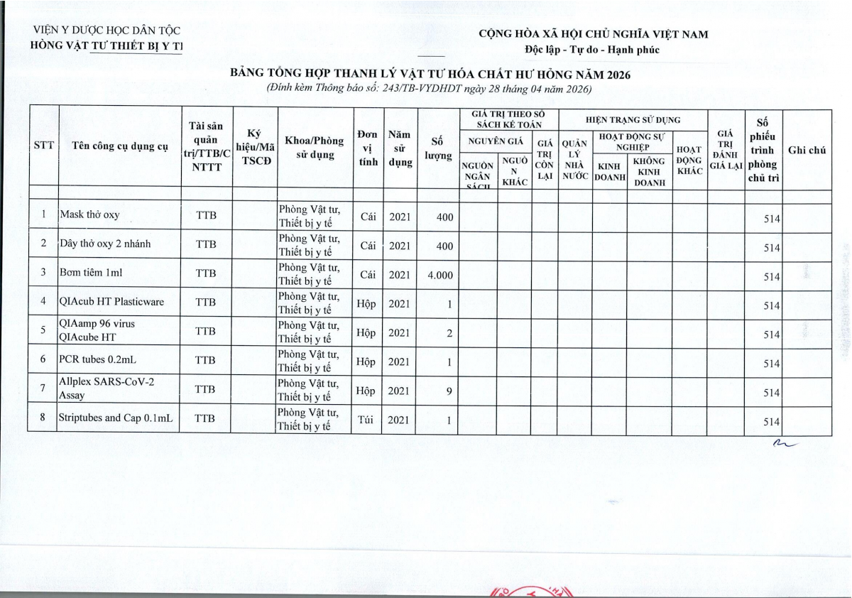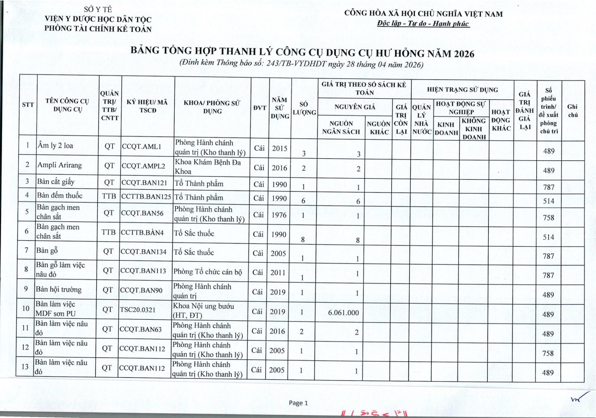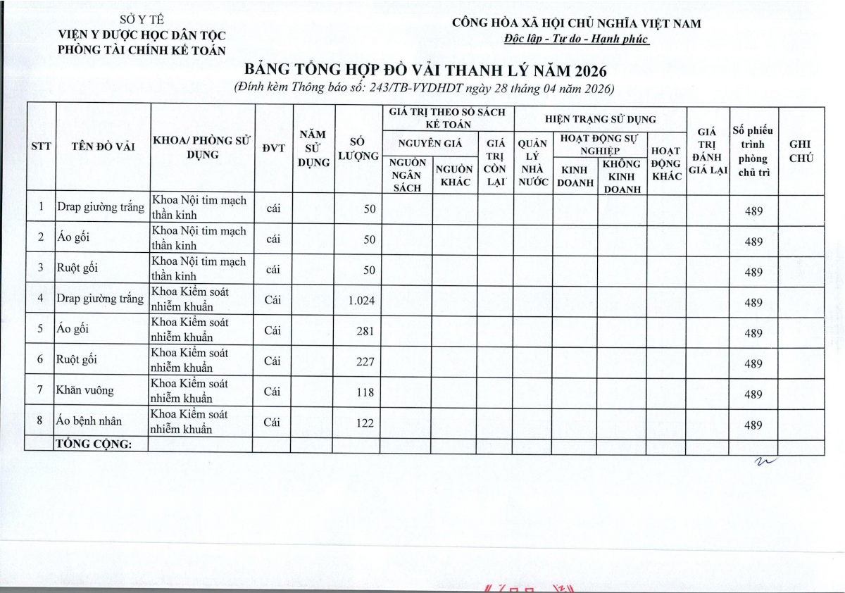 Thông báo số 243 về việc bán thanh lý công cụ dụng cụ, đồ vải, hóa chất hư hỏng năm 2026