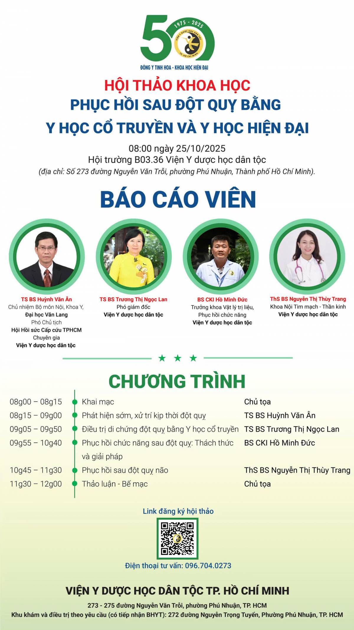 TIN TỨCThông báo Hội Thảo Khoa Học – Phục Hồi Đột Quỵ Bằng Y Học Cổ Truyền Và Y Học Hiện Đại 08:00 ngày 25/10/2025 Hội trường B03.36 Viện Y dược học dân tộc (địa chỉ: Số 273 đường Nguyễn Văn Trỗi, phường Phú Nhuận, Thành phố Hồ Chí Minh). 23/10/2025 57 Share on Facebook Tweet on Twitter tweet