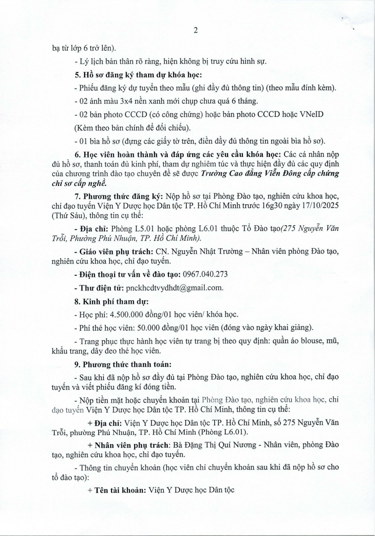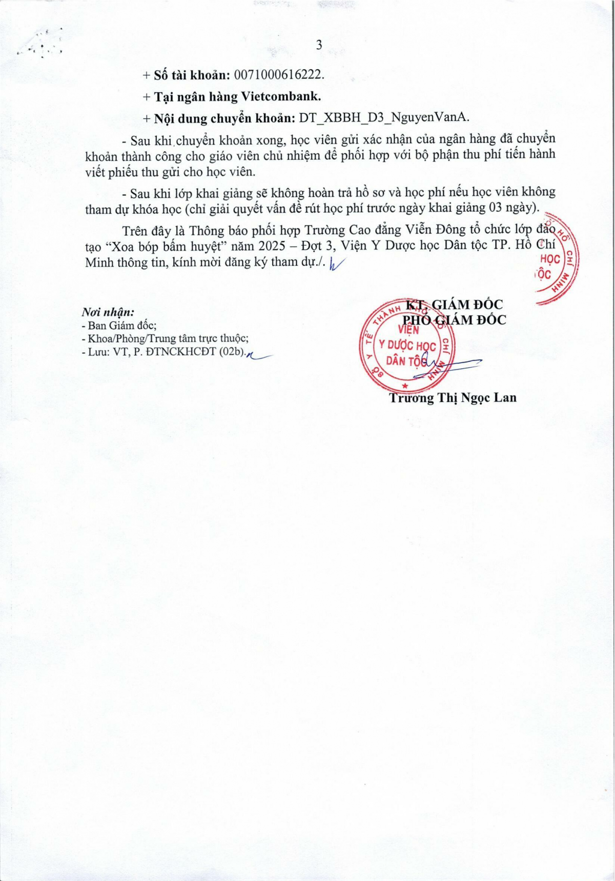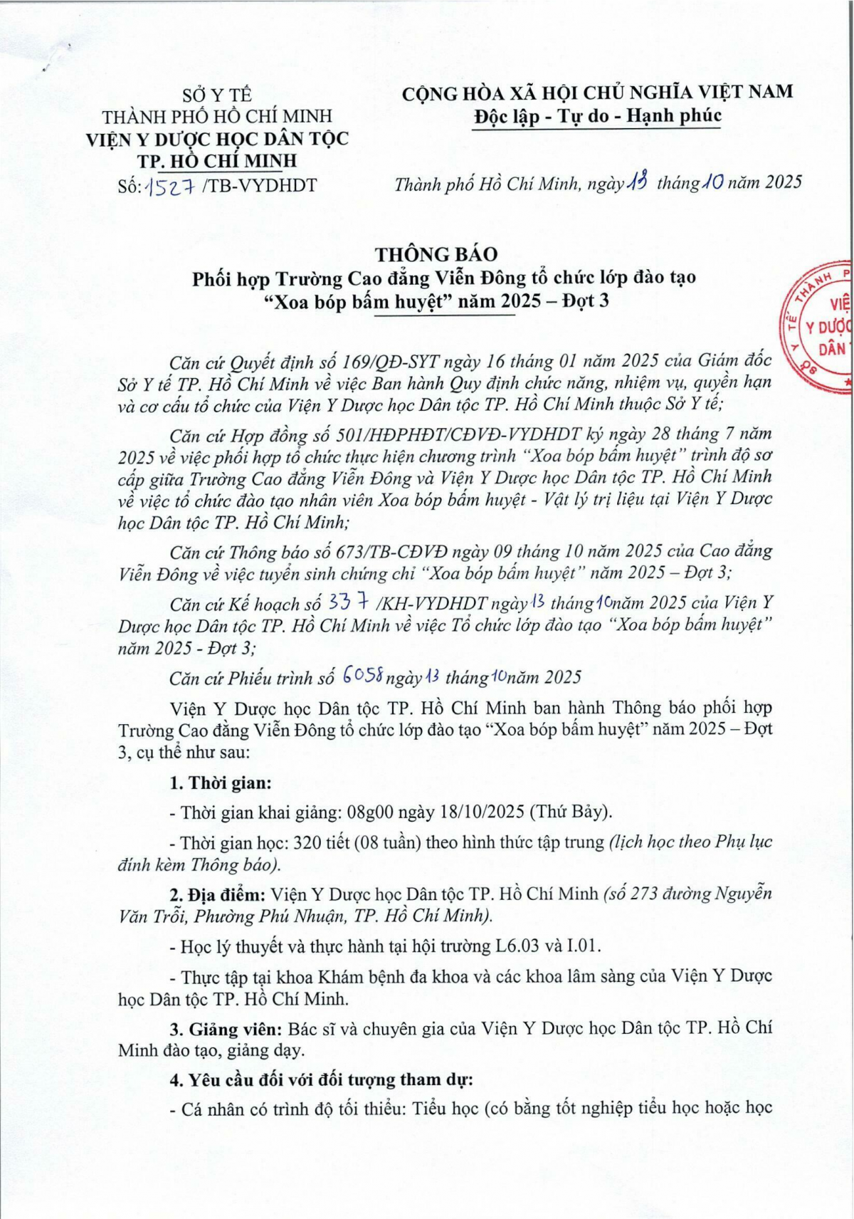 Thông báo 1527 Phối hợp Trường Cao đẳng Viễn Đông tổ chức lớp đào tạo Xoa bóp bấm huyệt năm 2025 đợt 3
