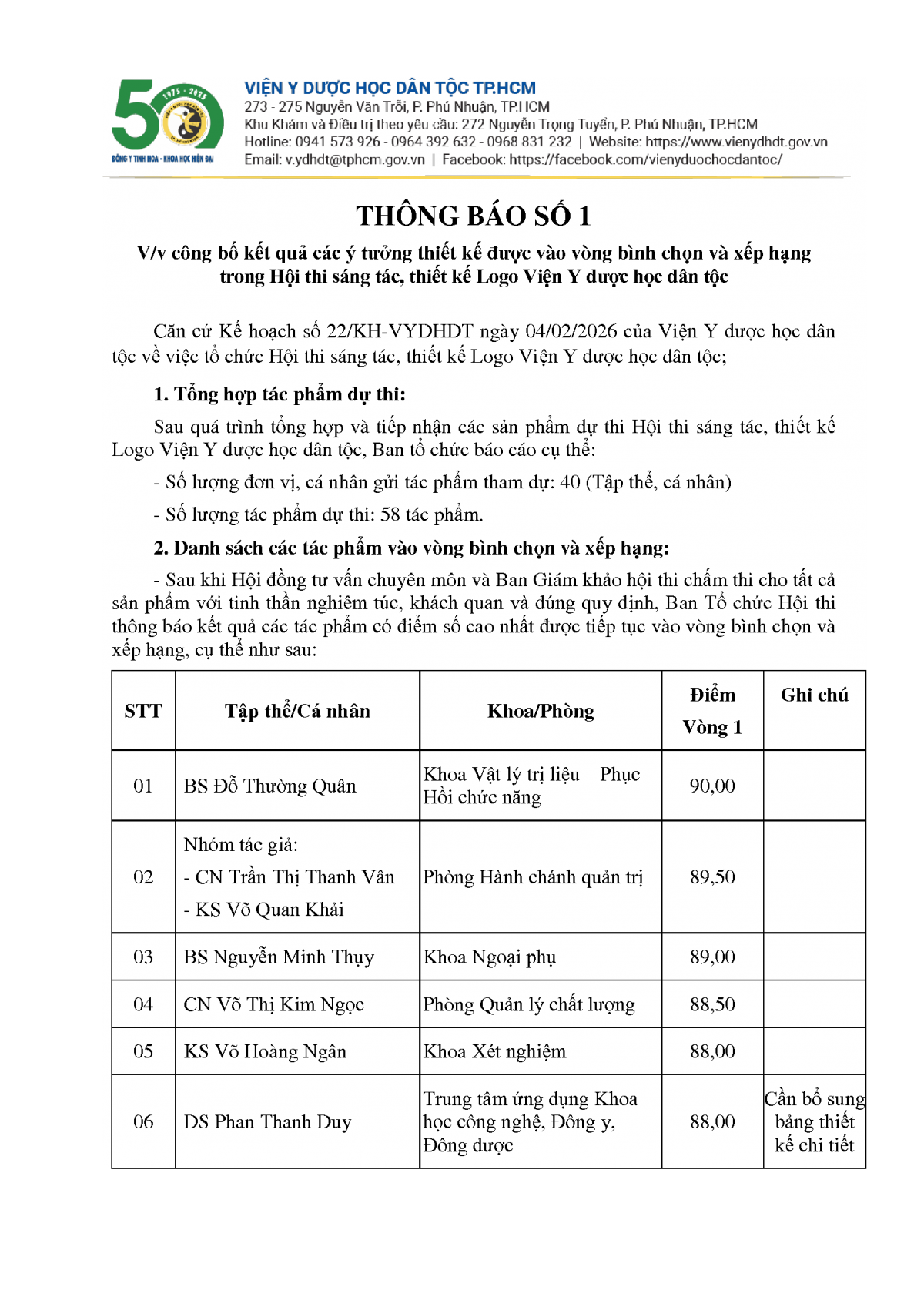 TIN TỨCThông báo Thông báo kết quả Vòng 1 Hội thi sáng tác, thiết kế Logo VIện Y dược học dân tộc 20/03/2026 11 Share on Facebook Tweet on Twitter tweet
